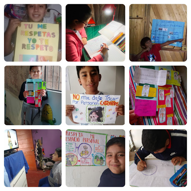 - Elaborar un afiche sobre la NO INVASIÓN A TU ESPACIO PERSONAL por personas desconocidas, ponle un lema, dibuja, escribe, recorta revisas, periódicos, usa tu creatividad. Pide ayuda a tu familia y conversa con ellos mientras vas elaborando tu afiche.